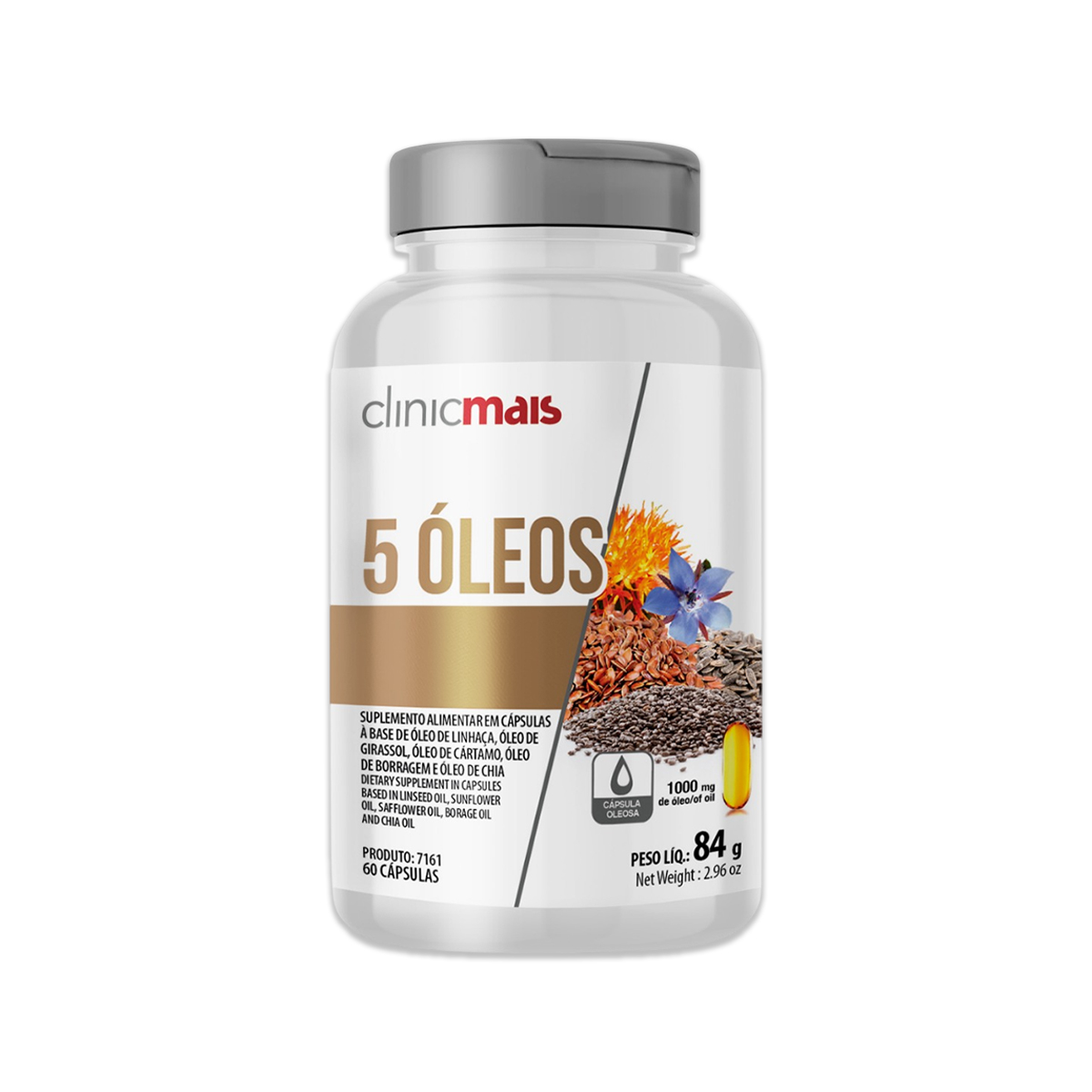 5 Óleos Linhaça Girassol Cártamo Borragem e Chia ClinicMais 60 Cápsulas