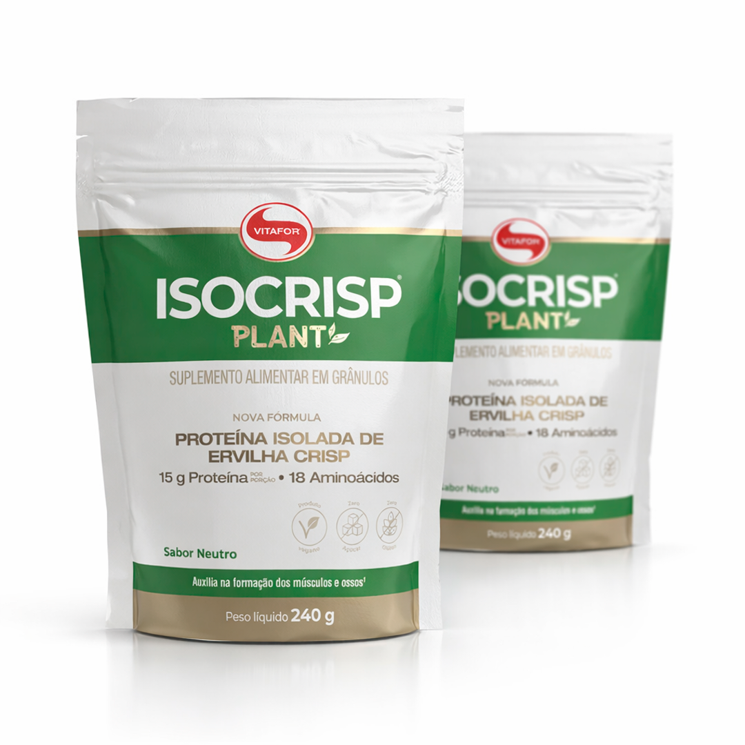O Isocrisp Plant Vitafor é um suplemento alimentar em grânulos elaborado com proteína isolada de ervilha e farinha de arroz. Apresenta textura crocante em flocos e pode ser incorporado em diferentes preparações, como cereais matinais, frutas, açaí, sopas ou saladas. As proteínas auxiliam na formação de músculos e ossos, sendo indicado para complementar a ingestão proteica diária conforme orientação de uso.