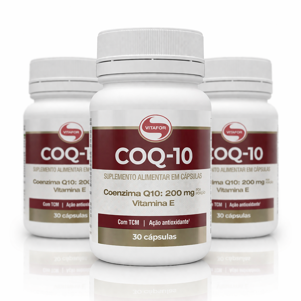 A Coenzima Q10 Vitafor é um suplemento alimentar em cápsulas formulado com coenzima Q10 e vitamina E. Apresenta composição combinada e formato prático para consumo diário, conforme orientação de uso.