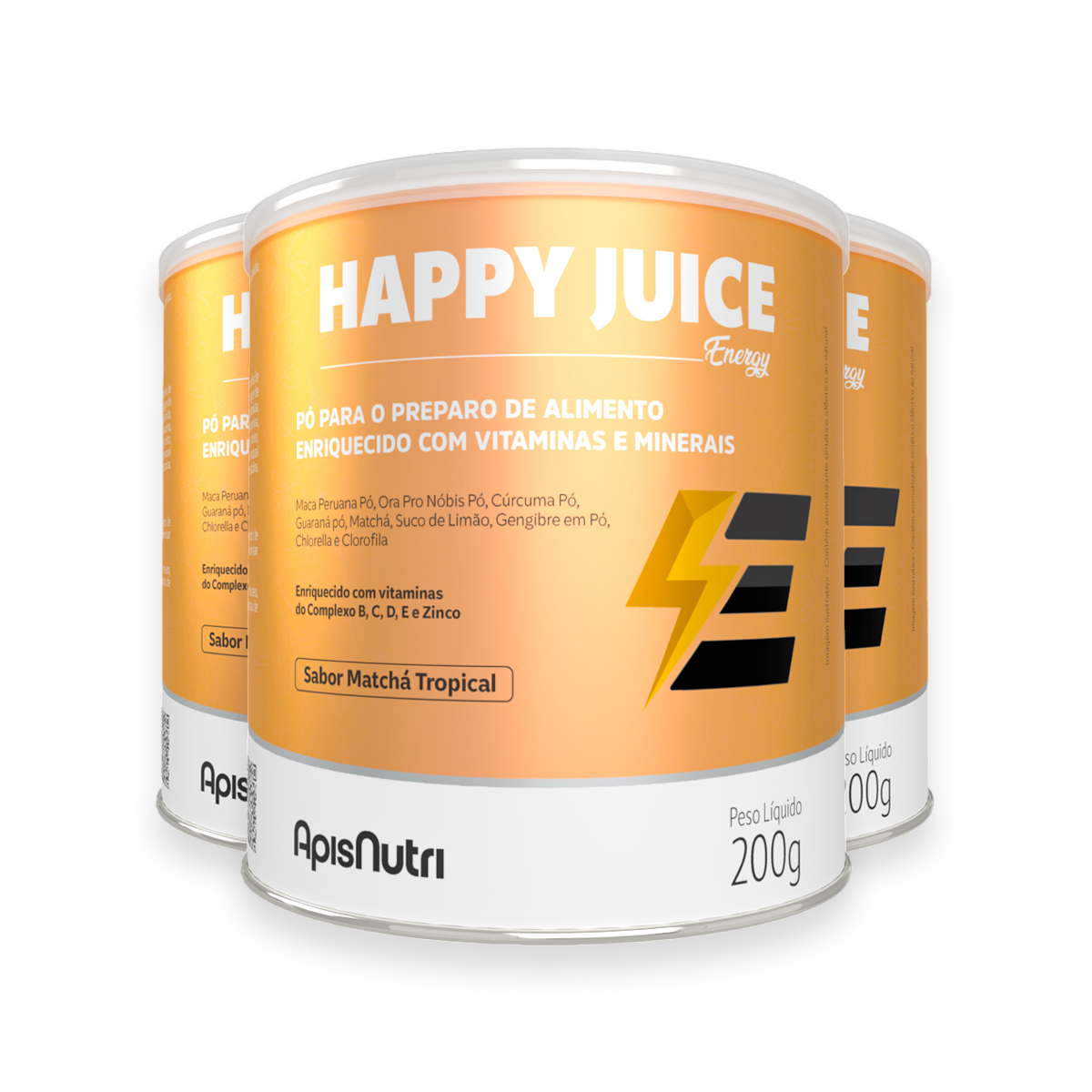 O Happy Juice Energy é um pó para preparo de bebida enriquecida com vitaminas e minerais, desenvolvido para trazer mais sabor, leveza e energia ao seu dia. Sua fórmula reúne ingredientes naturais como matchá, maca peruana, gengibre, cúrcuma, chlorella e ora-pro-nóbis, combinados em uma bebida refrescante de sabor tropical cítrico.