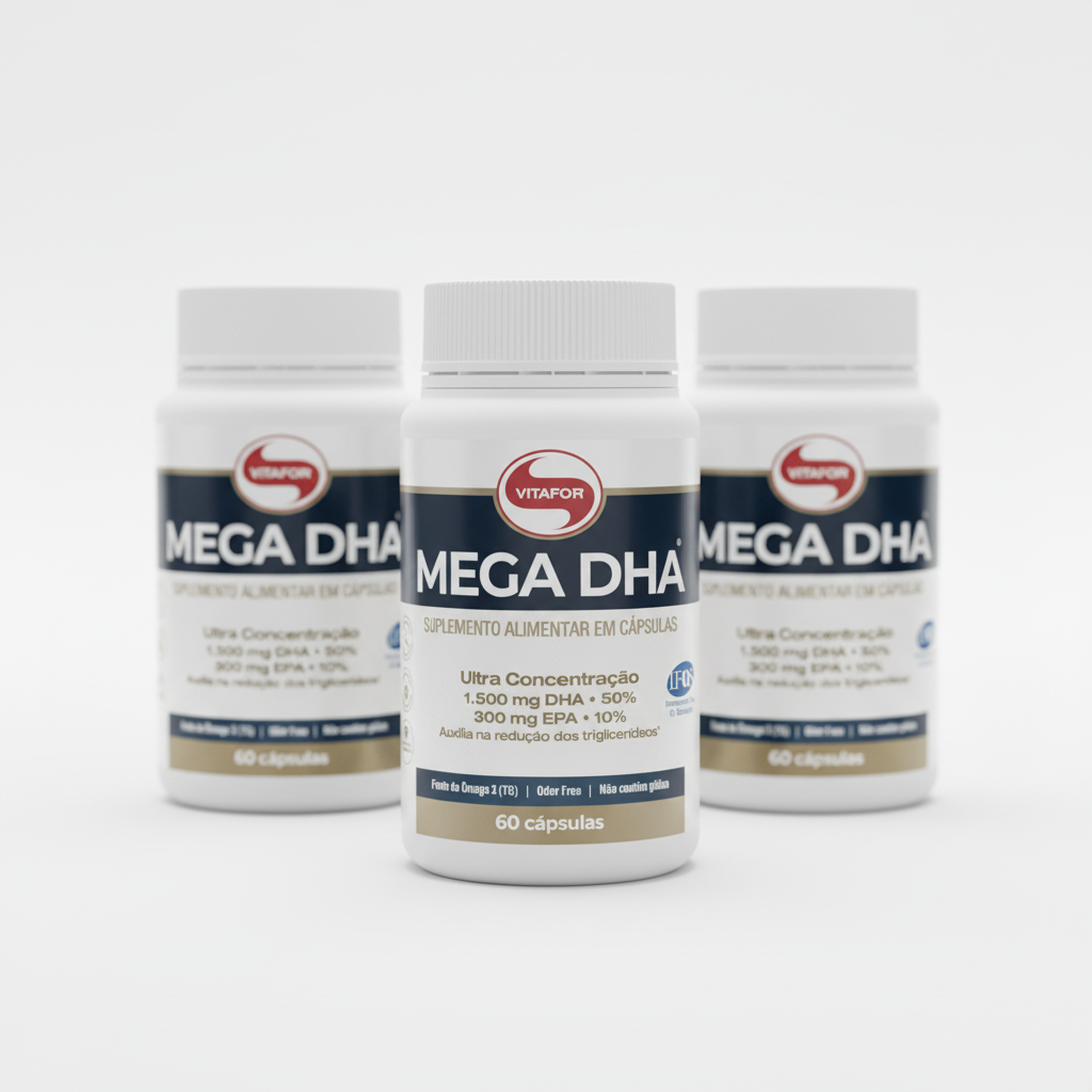 O Mega DHA Vitafor é um suplemento alimentar em cápsulas formulado com óleo de peixe. Apresenta formato prático para consumo diário, conforme orientação de uso, e cápsulas softgel que facilitam a ingestão.