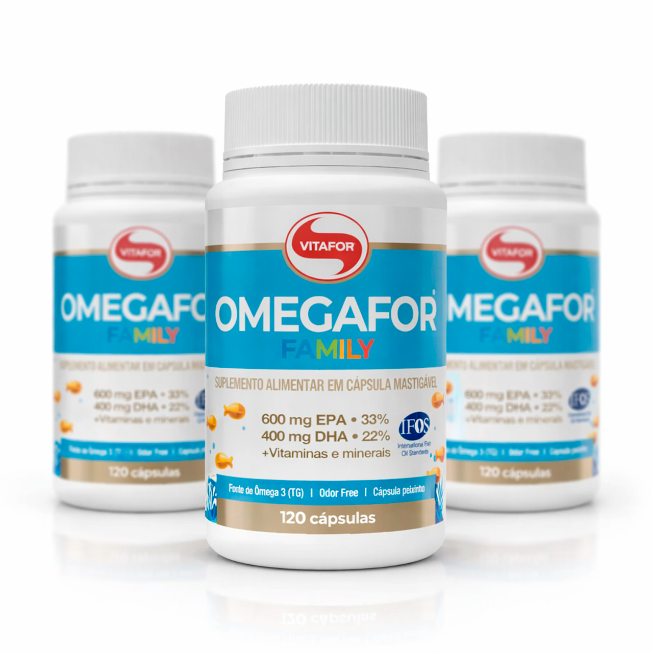 O Omegafor Family Vitafor é um suplemento alimentar à base de óleo de peixe, fonte de Ômega 3 na forma TG (triglicerídeos), associado às vitaminas K, D e B12, além do mineral selênio. Sua formulação fornece 600mg de EPA e 400mg de DHA por porção, oferecendo um perfil nutricional equilibrado e desenvolvido para facilitar a absorção e proporcionar maior conforto gástrico. O produto é extraído de peixes de águas frias e profundas de regiões polares e possui Certificação Internacional IFOS™, que assegura elevados padrões de pureza, qualidade e segurança, além do Selo de Qualidade VLabor. As cápsulas são Odor Free e apresentam formato pequeno de peixinho, facilitando o consumo diário.