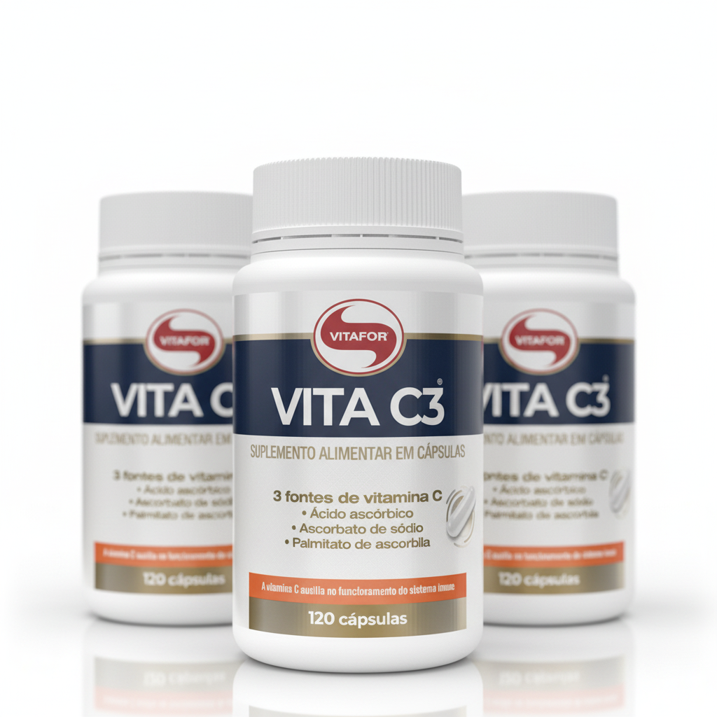 O Vita C3 Vitafor é um suplemento alimentar em cápsulas formulado com diferentes fontes de vitamina C. Apresenta composição combinada e formato prático para consumo diário, conforme orientação de uso.