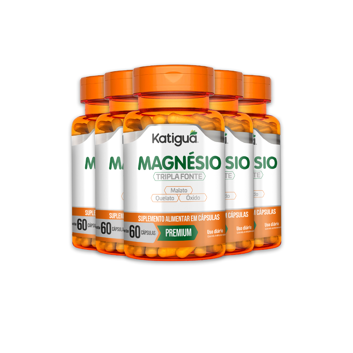 O Kit 5 Magnésio Tripla Fonte 500mg é um suplemento alimentar em cápsulas que combina três fontes de magnésio: dimagnésio malato, bisglicinato de magnésio e óxido de magnésio. Sua formulação inclui ainda carbonato de cálcio, celulose microcristalina, dióxido de silício e estearato de magnésio. A cápsula é composta por gelatina e corante dióxido de titânio.