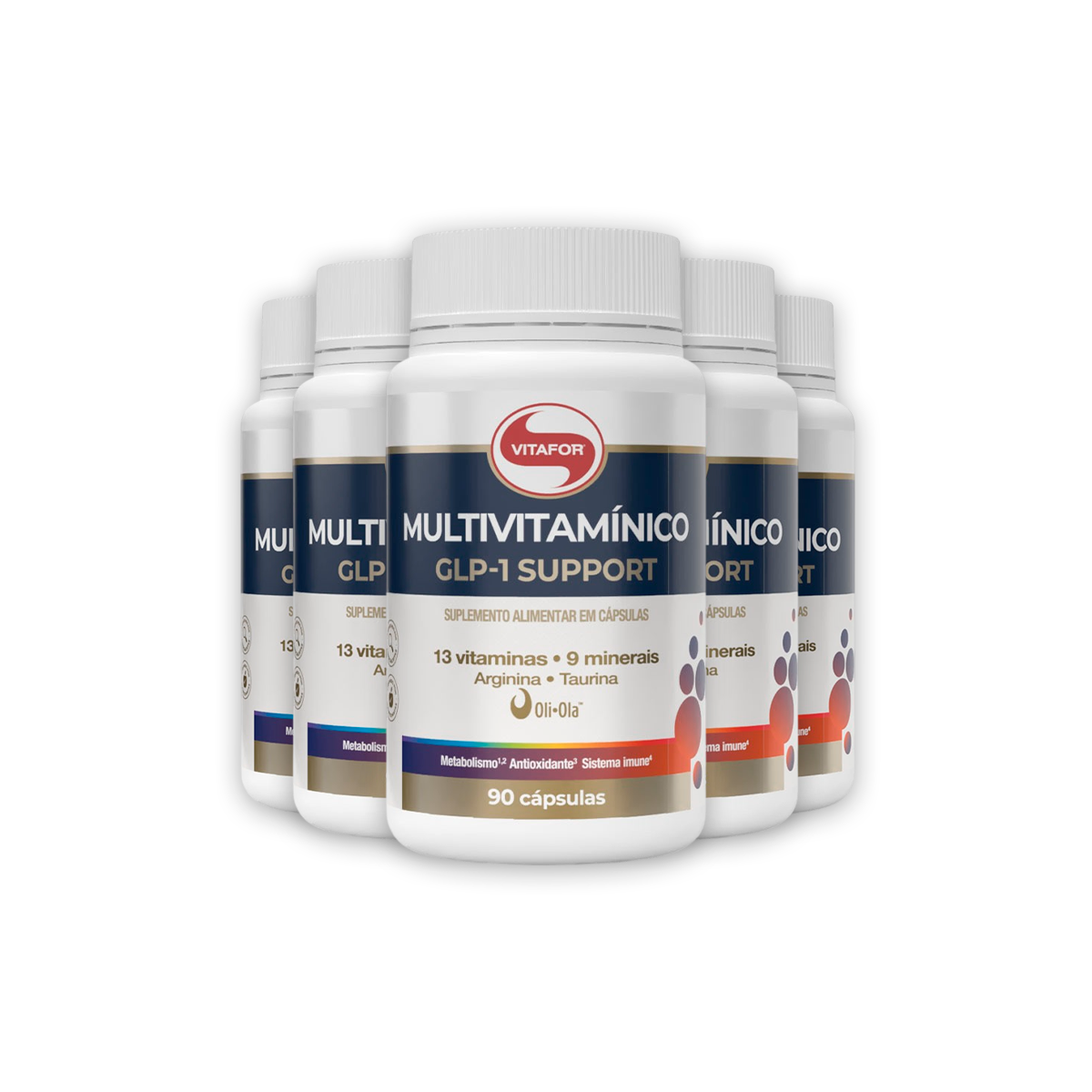 Kit 5 Multivitamínico Vitafor GLP1-1 Support 90 Cápsulas Support é um suplemento alimentar em cápsulas com vitaminas, minerais, aminoácidos e extrato de oliva, desenvolvido para complementar a ingestão desses nutrientes na rotina diária.