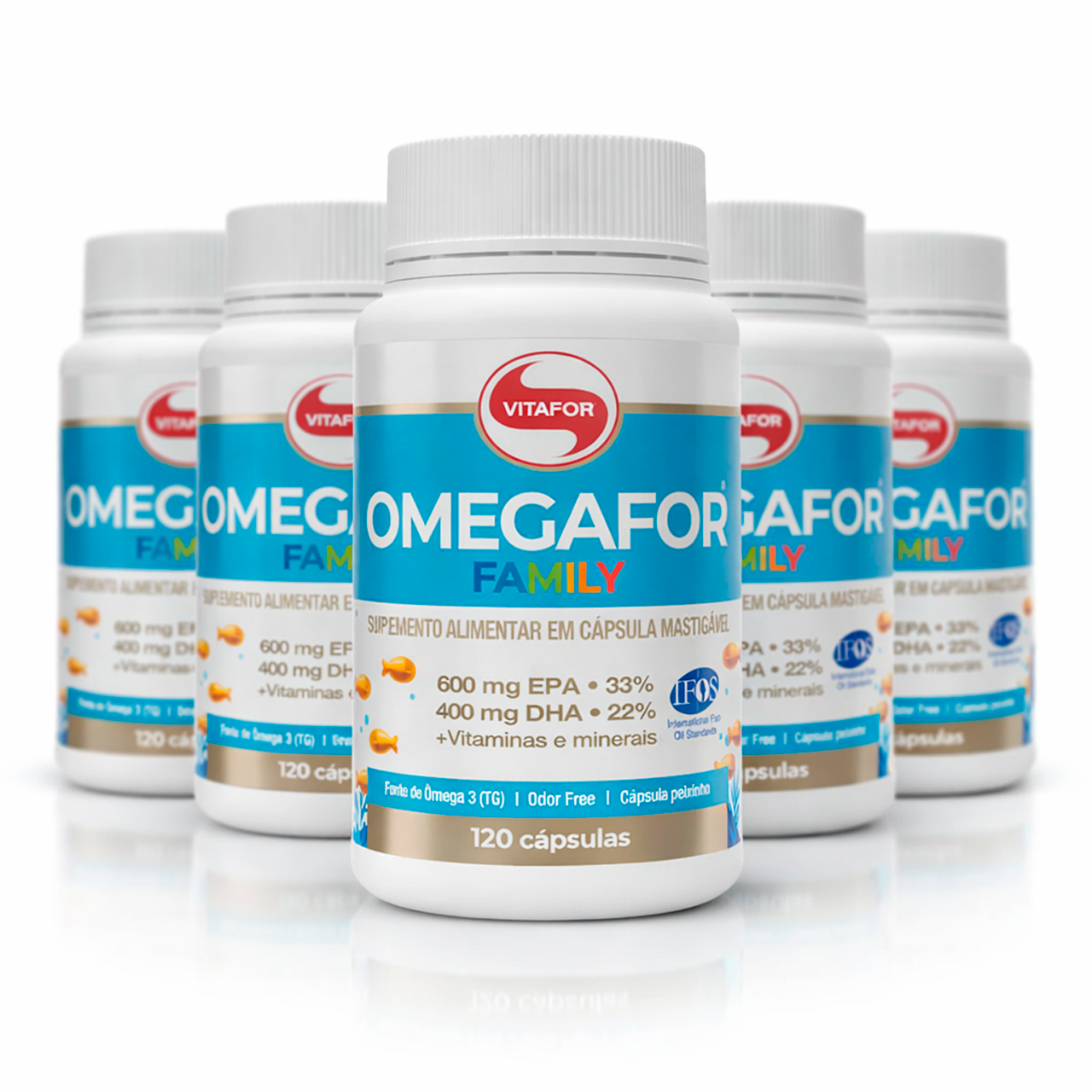 O Omegafor Family Vitafor é um suplemento alimentar à base de óleo de peixe, fonte de Ômega 3 na forma TG (triglicerídeos), associado às vitaminas K, D e B12, além do mineral selênio. Sua formulação fornece 600mg de EPA e 400mg de DHA por porção, oferecendo um perfil nutricional equilibrado e desenvolvido para facilitar a absorção e proporcionar maior conforto gástrico. O produto é extraído de peixes de águas frias e profundas de regiões polares e possui Certificação Internacional IFOS™, que assegura elevados padrões de pureza, qualidade e segurança, além do Selo de Qualidade VLabor. As cápsulas são Odor Free e apresentam formato pequeno de peixinho, facilitando o consumo diário.