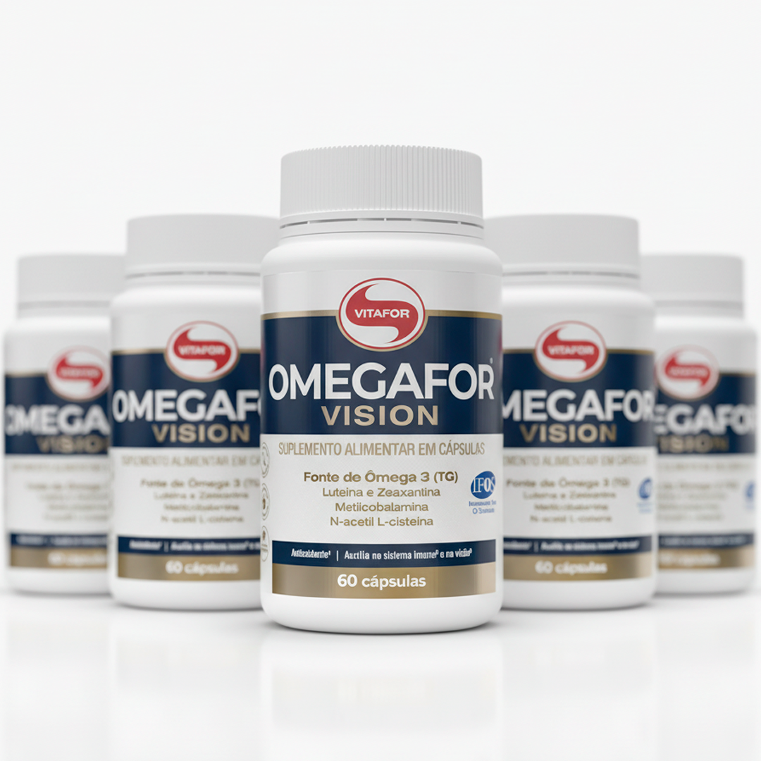 O Omegafor Vision Vitafor é um suplemento alimentar formulado com óleo de peixe, fonte de ácidos graxos Ômega 3, associado a nutrientes selecionados como luteína, zeaxantina, taurina, N-acetil L-cisteína e vitaminas. Produzido com óleo de peixe na forma TG (triglicerídeos), apresenta elevado padrão de qualidade e pureza. O produto possui Certificação Internacional IFOS™, que atesta critérios rigorosos de controle e qualidade, além do Selo de Qualidade VLabor da Vitafor.