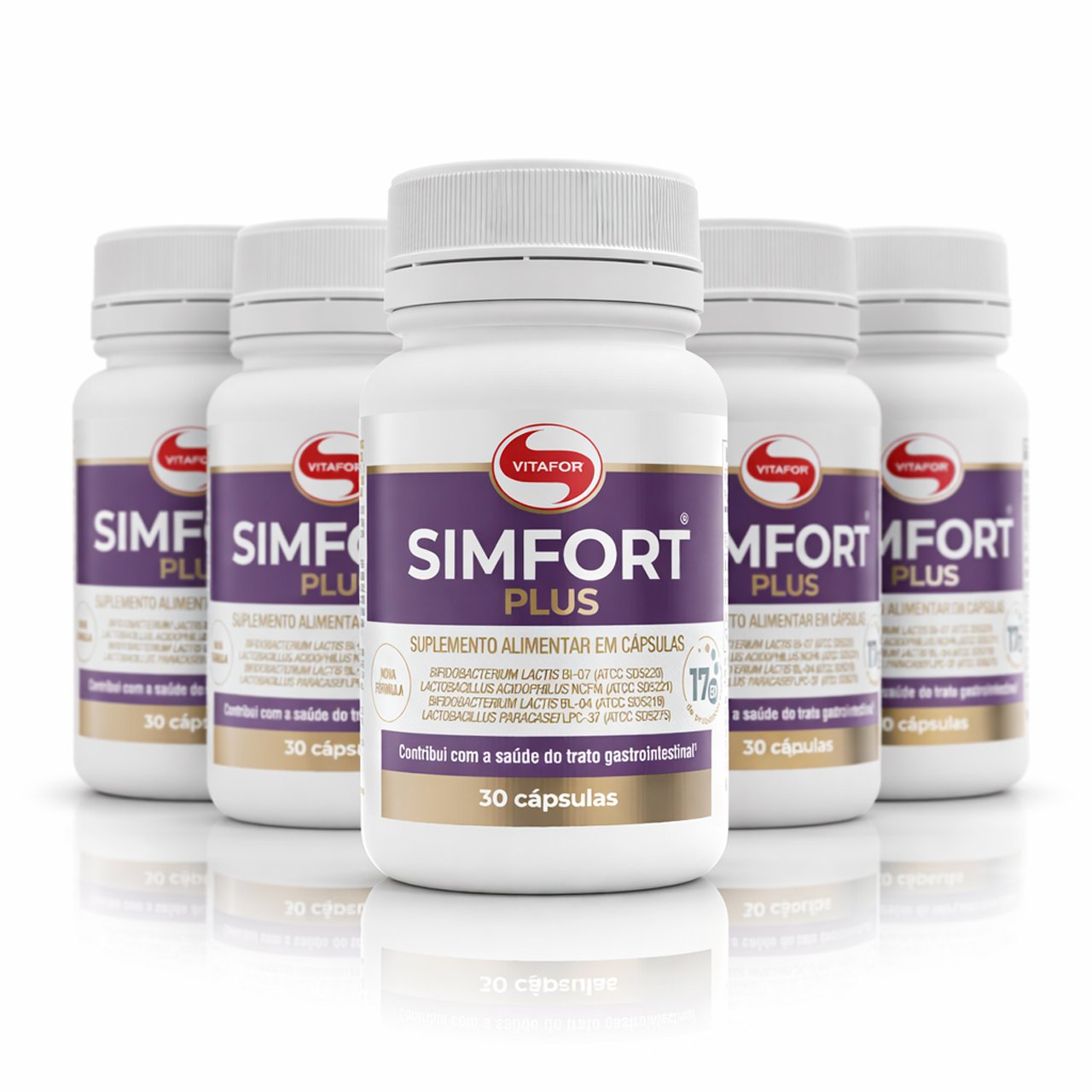 O Simfort Plus Vitafor é um suplemento alimentar. Cada porção fornece 17 bilhões de micro-organismos vivos, oferecendo um aporte concentrado para complementar a alimentação diária. Sua apresentação em cápsulas proporciona praticidade no consumo, e a formulação é indicada para uso adulto, conforme orientação de uso.