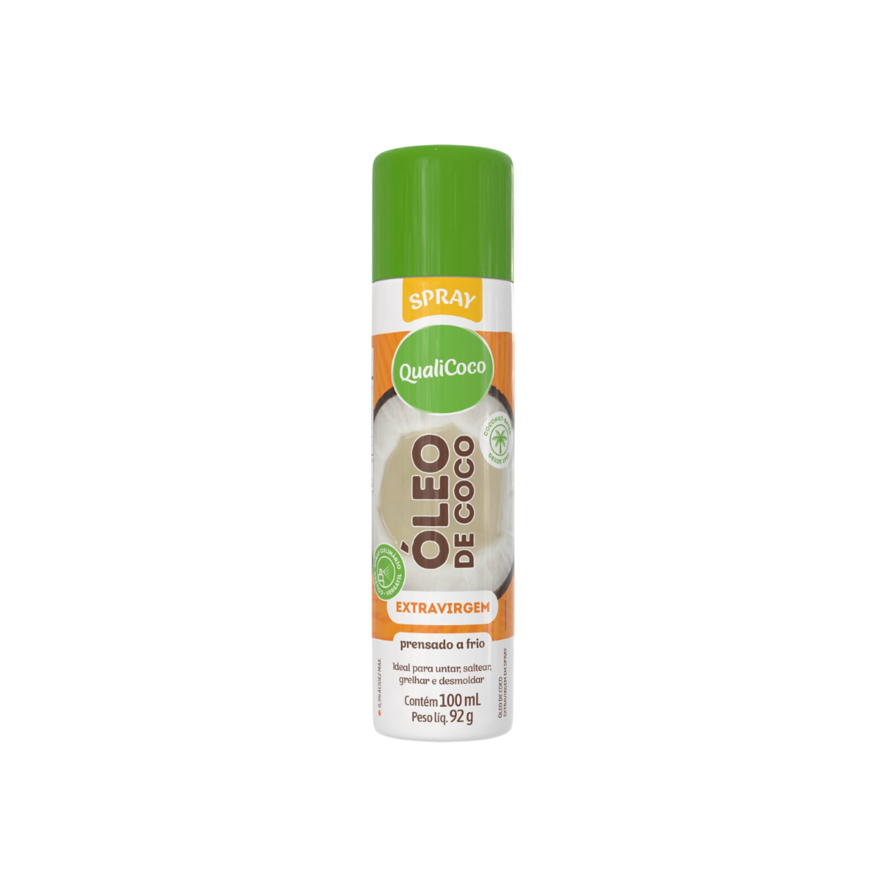O Óleo de Coco Spray Qualicoco Extravirgem é obtido da amêndoa do fruto da espécie Cocos nucifera L. (coco-da-baía), extraído por prensagem mecânica a frio. Produto não hidrogenado, apresentado em embalagem spray.