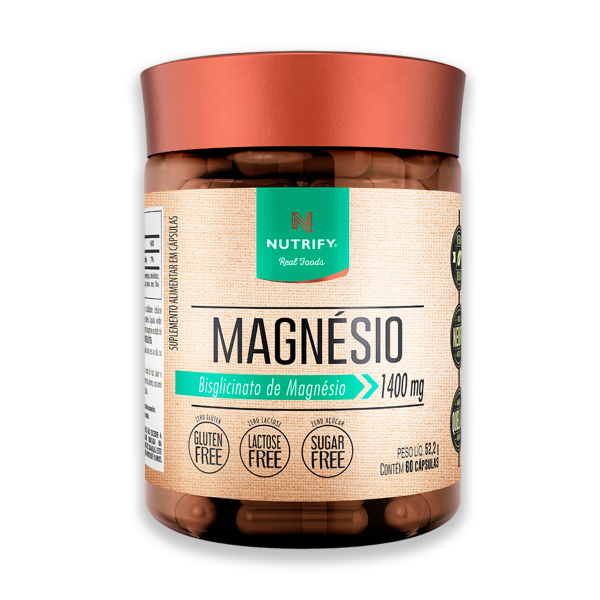 O Magnésio Nutrify é um suplemento alimentar em cápsulas formulado com bisglicinato de magnésio, uma forma estável e de alta qualidade do mineral. As cápsulas possuem coloração verde natural e são práticas para consumo diário.